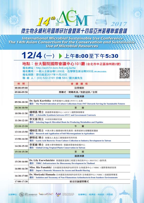 財團法人食品工業發展研究所僅訂於2017年12月4日(一),假台大醫學院國際會議中心101廳,舉辦「微生物永續利用國際研討會暨第十四屆亞洲菌種聯盟會議」。