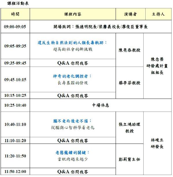 2016年第五屆青少年醫學營-人人都長壽的超高齡社會 # 主題:人人都長壽的超高齡社會 時間:2016年5月29日(星期日) 上午9:00-12:00 地點:陽明大學活動中心大禮堂(台北市北投區立農街2段155號) 目標:提高青少年對高齡醫學之知識與興趣,培養國家未來的生醫科技人才。 參加者:公私立高中生及教師。 報名方式及費用:網路免費報名(採網路報名,額滿截止,限1000名) 報名截止日期:即日起至2016年4月30日 活動費用:免費,會後並發放研習証書一份。 主辦單位:國立陽明大學、臺北榮民總醫院、財團法人張昭鼎紀念基金會 協辦單位:私立延平中學 報名查詢:http://www.saints-united.com/cctmf/cct_rs97.jsp 課程活動:請參考附件(PDF檔案)