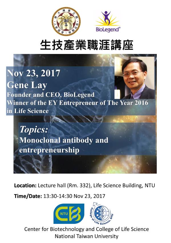 主講人賴正光(Gene Lay, M.S., D.V.M.)為BioLegend(百進生技股份有限公司)執行長暨創辦人,獲頒2016年傑出企業家獎EY Entrepreneur of The Year 2016,且是生命科學領域的唯一獲獎人。