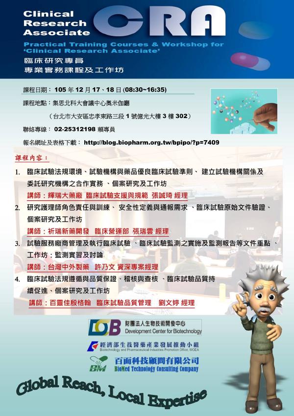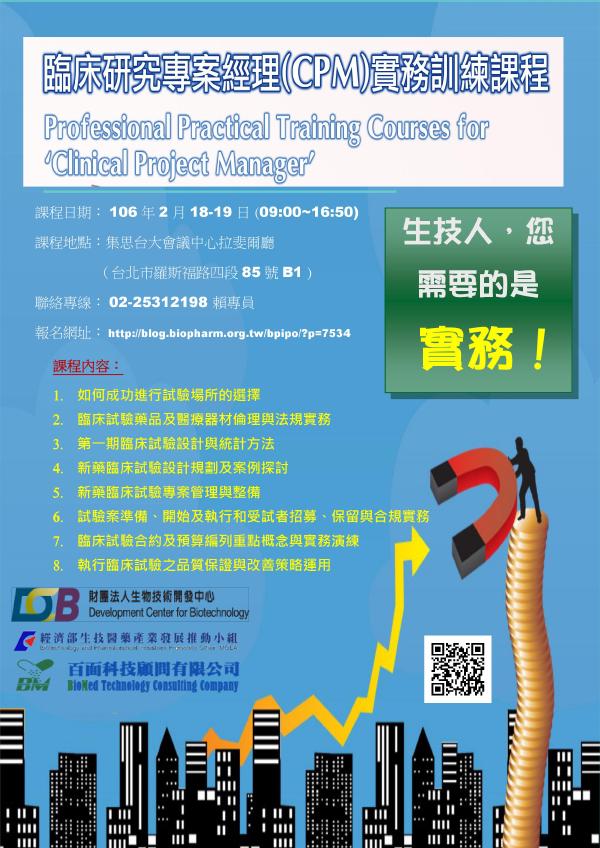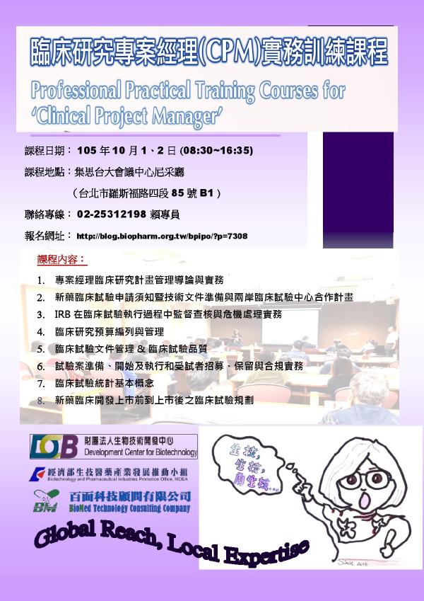 本課程為台灣極寶貴之專業實務訓練課程,為無經驗或已任CPM之學員提供全方位藥品、醫材、食品、學術臨床研究支CPM角色功能指導。 本課程可提供臨床研究新職涯選擇之整備,藉助豐富經驗的實務講師提供個案研究、專業表格等寶貴工具進行全方位教學,可供立即運用於CPM工作。 課程設計涵蓋CPM工作必備職能,遵循ICH GCP法規架構,師資成員延聘自CRO、生技公司、著名藥廠、學界及醫學中心等深具臨床研究實務經驗工作者。 對有意加入CPM工作卻不知如何切入者或具實務年資經驗但亟盼業務精進者均提供難得的學習機會! 小班教學名額有限,請有志者把握難得的機會報名,全程參與者生技中心(DCB)將提供學員精美上課證書。