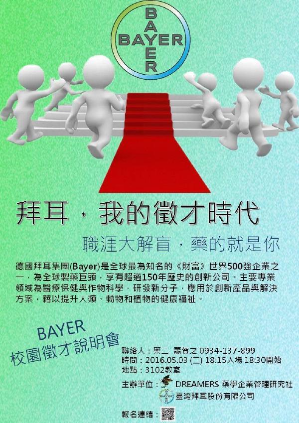 拜耳,德國排名第一的國際藥廠 精采絕倫的演講內容,絕對讓你收穫滿滿 想更了解拜耳藥廠未來的發展嗎? 想近距離與主管接觸嗎? DREAMERS邀請您,一同參加拜耳徵才說明會 讓我們用行動創造自己耀眼的未來!