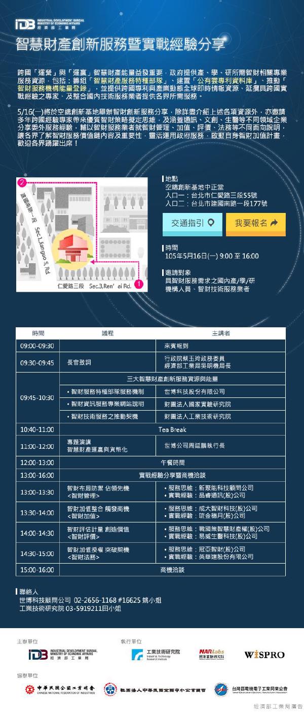 5/16(一)於空總創新基地舉辦智財創新服務分享,除詳盡介紹上述各項資源外,亦邀請多年跨國經驗專家帶來優質智財策略擬定思維,及涵蓋通訊、文創、生醫等不同領域企業分享委外服務經驗,輔以智財服務業者就智財管理、加值、評價、法務等不同面向說明,讓各界了解智財服務價值鏈內容及重要性,靈活運用政府服務,啟動自身智財加值計畫,歡迎各界踴躍出席!