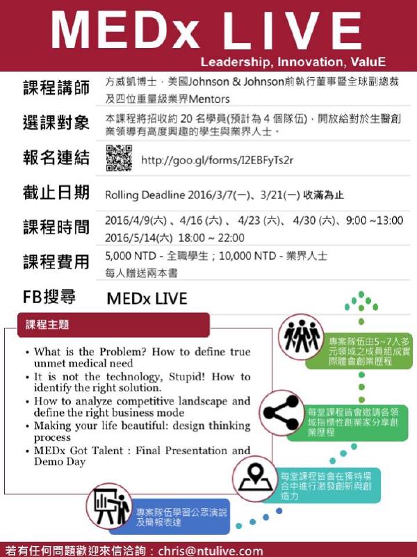 MEDx LIVE 2016 Course 是一個打造台灣未來醫療科技人才的課程, 以project-based互動式教學方式引導學員進行思辨, learning by doing.