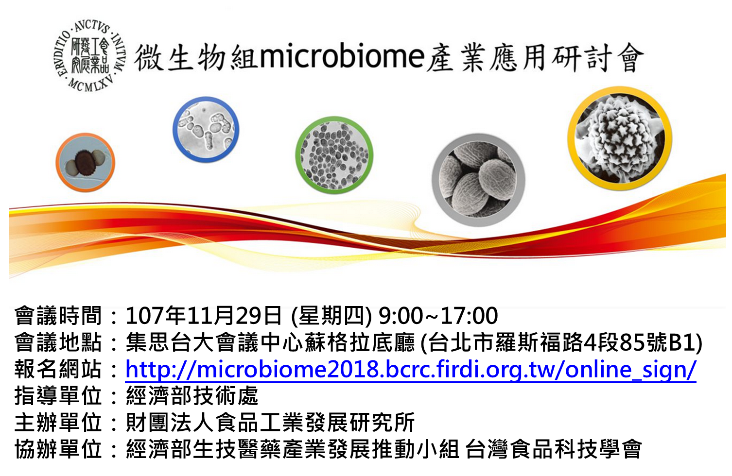 微生物組microbiome產業應用研討會2018年3月20日 · 協同宣傳財團法人食品工業發展研究所僅訂於2018年11月29日(四),假台大集思會議中心蘇格拉底廳,舉辦「微生物組 microbiome 產業應用研討會」。誠摯邀請產學研各界先進踴躍參與指教。