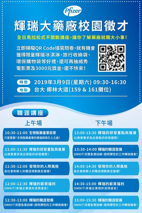2019年輝瑞台大校園徵才博覽會2019年1月1日 · 協同宣傳【2019年輝瑞台大校園徵才博覽會開跑啦!】 3/9椰林大道攤位159和161,輝你不可! 立即填寫簡短問卷並上傳履歷,就有機會獲得威秀電影票一組(2張)喔!