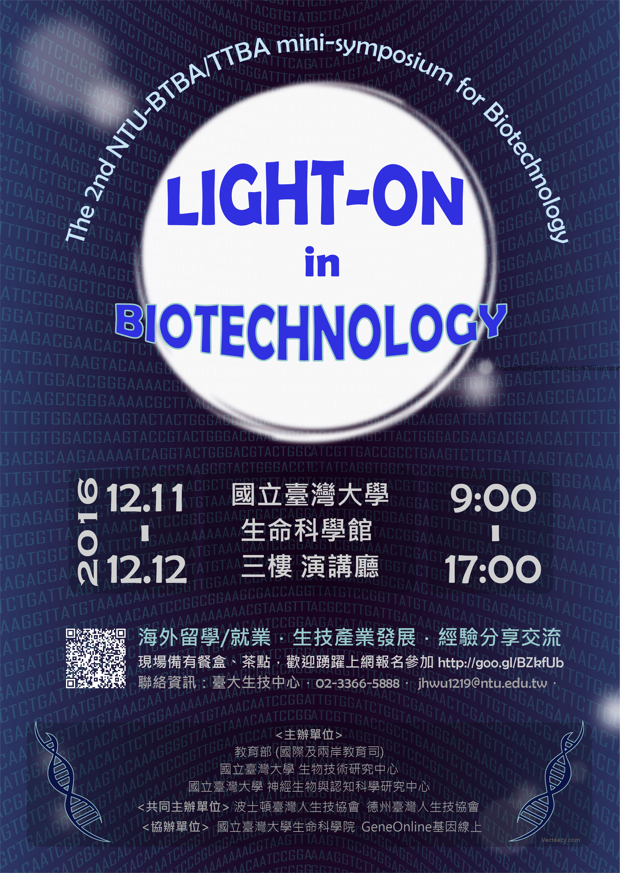 國立臺灣生物技術研究中心將在2016年12月11-12日於生命科學館3樓演講廳舉辦「The 2 nd NTU-BTBA/TTBA mini-symposium for Biotechnology - Light-On in Biotechnology」,會中將邀請來自以生技中心為基礎的NTU-BioGroup老師們、波士頓臺灣人生技學會、德州臺灣人生技學會、臺灣新創生技公司以及臺灣生技交流社群的專家學者們,針對創業、產業環境、生技高階人才培訓和就業發展等多面相的議題,分享其在海內外的經驗與理念。 無論您是想至海外留學、就業的生技新秀、想要了解生技未來發展的青年學子,抑或是想要尋求合作機會的專家學者,在此誠摯邀請各位報名參與本研討會,一同集思廣益,在國際化的浪潮下開創臺灣生物科技產業的價值!