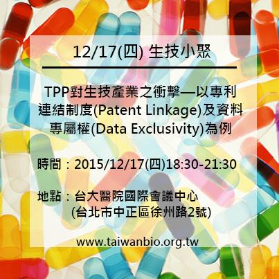 TPP 對生技產業之衝擊2015年12月8日 · 協同宣傳12/17(四)生技小聚–TPP對生技產業之衝擊—以專利連結制度(Patent Linkage)及資料專屬權 (Data Exclusivity) 為例 您想了解 TPP 將在生技製藥產業法規登記及產品生命週期所帶來的正反面衝擊,並提前規畫或改變公司經營之應變策略嗎? 今年最後一場生技小聚,於12月17日舉辦,特別邀請負責「TPP 醫藥專利修法計畫」的國立台北大學李素華副教授及中研院法律學研究所吳全峰副研究員演講