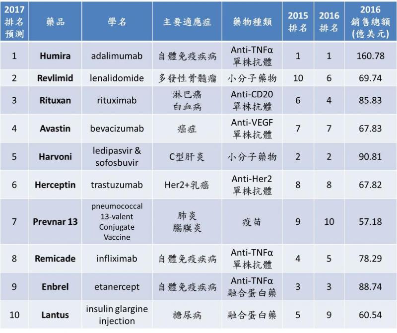 (註)根據 EP Vantage 做的 2017 排名預測中,Remicade 與 Enbrel 的銷售額僅針對 “原公司 (J&J 及 Amgen)” 的銷售額預測排名;而2015、2016 的排名是依照 J&J 加 Merck、Amgen 加 Pfizer 的全球藥物銷售總額做評比,因此 Remicade 與 Enbrel 才會掉至第 8、9名。
