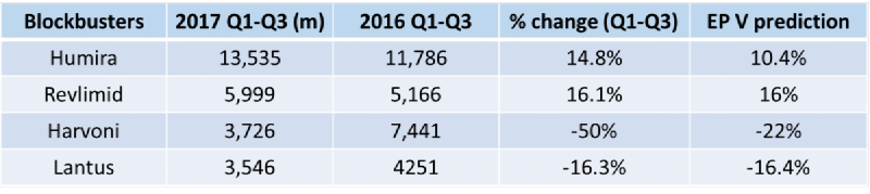 根據 EP Vantage 預測 2017 年 Humira 與 Relimid 在 2017 年銷售額仍然會繼續上漲,Harvoni 與 Lantus 將會有明顯的衰退,其餘藥物皆不會有太大變動。可以從以下表格中看到2017 Q1-Q3 累積的銷售額與 EP Vantage 預測變化做比較。