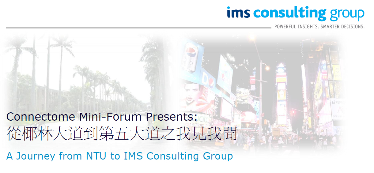 回到台灣的Jason,由於本身持續在Linkedin上更新自己的資訊,又正逢台灣IMS需要拓展顧問業務,而獲IMS人力資源部門屬意,開始踏入顧問這個行業。IMS Consulting Group是專注在生命科學及藥學產業的顧問公司,奠基於母公司IMS Health完整醫藥品資料庫之上,目前是全球專注於醫藥產業的顧問公司的領先佼佼者,雖然Jason在念書時的所學廣泛(生物統計、流行病學、藥物經濟和醫務管理等),但因緣際會下能進入顧問公司,一方面戰戰兢兢,另一方面卻也把握機會和同事以及客戶們學習,而後進一步把握機會,爭取並獲得轉到美國紐約總公司工作的機會。
