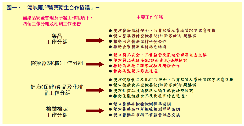 根據衛生署食品藥物管理局的公開資訊,2012 年 9 月 4 號發布的「海峽兩岸醫藥衛生合作協議」,開宗明義定下合作領域為:傳染病防治、醫藥品安全管理及研發、中醫藥研究與交流及中藥材安全管理、緊急救治和其他互相同意的領域。