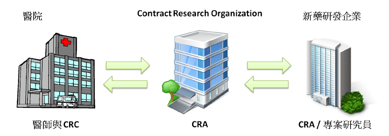 CRO (Contract Research Organization / Clinical Research Organization) 是一個專業分工的生技服務業 (註1),分為規劃與執行等許多環節,各環節中每個人的工作內容皆不相同,依照發生流程簡述各工作內容如下: 依法規撰寫計畫書 (需與醫師以及廠商開會討論),計畫書送審,與醫院協調與簽約等事項 (Site Star-up Specialist),臨床試驗主持人會議,而 Monitor (一般大家所稱的 CRA 皆為此類別)則需至醫院檢閱病例報告表 (Case Report Form, CRF)、計畫書與病歷以及確認 CRC (Clinical Research Coordinator) 工作品質,嚴重不良反應通報,統計與數據資料分析,報告書撰寫等。