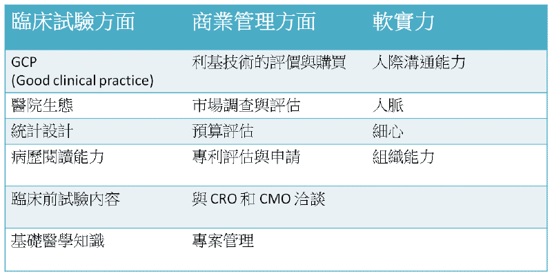 至於如何確保 CRO 的服務品質進而確保公司的新藥臨床試驗品質,就是一件相對複雜的事情了,主要精神是當你花了幾千萬之後,你要確保試驗就算失敗也不是因為人為疏失所造成,而最好的態度,就是把這些錢當成是你投資的,如此一來你才會戰戰兢兢的去面對它。而為了做好這份工作,需要有廣泛但不需太深入的背景知識來支持,在此將專案人員所需的能力整理如下: