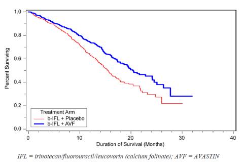 另外,我們可以從其他發佈的消息得知: 期中分析及期末分析皆依統計學上雙尾檢定 p 值來檢驗治療組與對照組間差異的顯著性。當檢驗的 p 值越小,則代表差異越顯著,亦即療效越明顯。一般而言,當檢驗 p 值小於或等於 0.05,就代表兩組在統計上有顯著的差異。依 PI-88 第三期臨床試驗設計,期中分析僅分析 60%的可分析病例,因此設定了高標準的 p 值(0.01806),用以檢定是否已達統計顯著性。 其實臨床從業人員大多知道常常試驗未達標到統計檢定標準也不能確定研究結果不好,很多時候常常因爲臨床試驗統計分析上樣本數目的不足所以沒有辦法得到統計意義上的顯著(但是臨床上卻是有顯著意義)。因此我們可以這麽說除非結果非常非常的好,不然在期中分析拿到顯著結果的機會是很低的。另外,基亞在期中設定了一個非常高的標準(P<0.01806,一般新藥標準為<0.05),更讓這變成一個幾乎不可能的任務。 另外由於該研究的目的是肝癌病人在切除手術後的無疾病存活期(DFS;disease free survival),也就是比較 PI-88 與未用藥病人的癌症復發時間差距,一般這種臨床試驗在第一年的時候由於多數的病人都沒有發病,因此很難看出效果的差距。然而,在期末分析時,如果分析三年的資料,抗腫瘤復發的效果將更為明顯,統計檢定也會更加顯著。舉例來説,下圖爲 AVASTIN 在試驗 AVF2107g 的存活分析,由於在初期的時候(10 個月以前),兩組的差距比較小,因此統計分析比較難達到顯著。