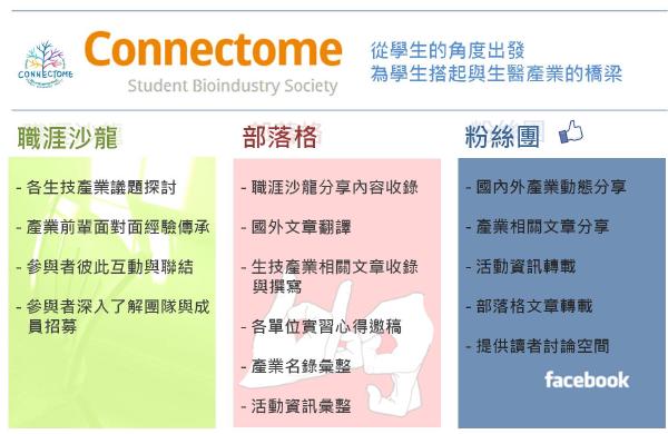 從 2012 年四月一群人有感於臺灣生技領域學生對生醫產業了解有限,以及對於自身未來的發展往往充滿迷惘與未知,因此創立了 Connectome 此一組織,希望能夠透過增進學生以及社會新鮮人對於產業的了解,進而釐清自我充實的方向與發展的利基,使其成為更有能力與方向的生技產業人才,進而使得人才找到揮灑的空間,產業找到有能力的人才,改變產學失衡與缺乏溝通的問題。半年過去,Connectome 已經逐漸摸索出合宜的運作模式,也略有成果,請讀者一起來回顧這期間的點點滴滴吧!